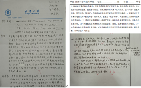 海洋地质学课程思政改革丰富课堂形式、完善考核举措等提高了学生的学习主动性、课堂参与度和课余时间利用率,改革后课程成绩更有区分度,提升了课程目标达成度和教学效果。课程教学团队完成的教改论文“海洋地质学‘课程思政’教学改革探索与实践”已被“中国人文社会科学核心期刊(2018年新刊入库)”、“双一流?中文核心期刊”《高教学刊》录用,将于2020年10月刊出,辐射影响作用进一步浮现。