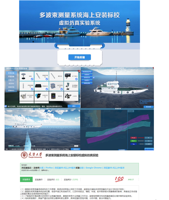 多波束测量系统海上安装标校是开展海洋测量工程的必要准备,也是《海底地形测量》和《海洋测量实习》课程的重要内容。本实验由海洋技术系张安民主任领衔,集合优秀教学团队、融合最新科研成果,利用三维仿真和虚拟现实技术,将多波束海上安装标校搬到线上,解决了传统多波束海上实验费用高、安全性差、亲身操作困难等问题,帮助学生深刻理解和掌握多波束系统海上安装、参数标定、误差校准等技术细节,实现多波束课堂理论知识讲授与外业测量实际操作的有机结合,提升学生解决复杂工程问题的能力。本虚拟仿真实验具有中英文版本,目前在天津大学海洋学院本科教学、“中国-东盟”智慧海洋学院、交通运输部北海航海保障中心天津海事测绘中心业务培训中实际使用。本课程已完成天津市一流课程建设,正在参评国家级一流课程。未来,我们将继续完善海洋探测技术系列虚拟仿真实验课程,以现代信息技术展现复杂海洋环境下海洋测量工程实践,助力复合型海洋科技人才培养、助力国家“海洋强国”建设。