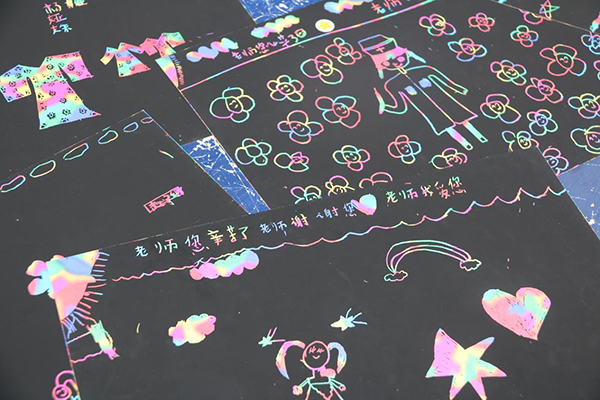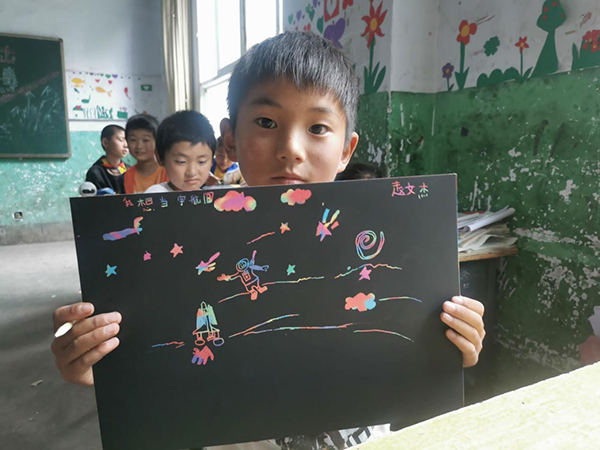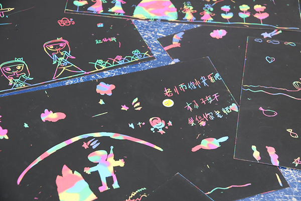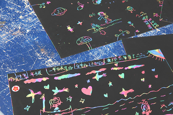 竹签随着孩子们的小手在纸上来回刮划,一幅幅梦想的图画渐渐清晰,你能在他们的眼中看到欢喜,看到向往,看到纯粹和清澈。