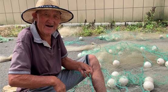 图为老爷爷正在编制渔网时看到我们的笑。