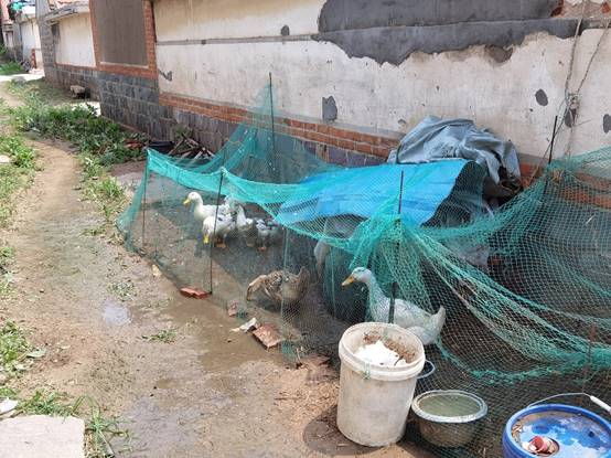 图为村民饲养的牲畜,常用渔网分隔。