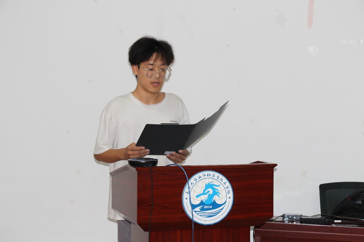 2021级本科生代表贾佳策发言,他回顾了刚入学时班主任和“师友”导师陪伴自己适应大学生活,帮助自己寻找适合的学习方法,寻找未来专业领域的过程。在导师的引导与帮助下,他选择了最有发展潜力,也是最适合自己的海洋学院。