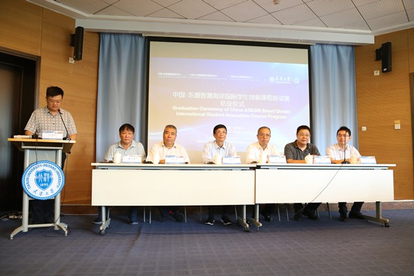 2019年8月30日,在“中国-东盟智慧海洋中心”框架下,由天津大学海洋科学与技术学院主办的“中国-东盟智慧海洋国际学生创新课程培训项目”汇报总结会暨结业仪式在天津大学卫津路校区第七会议室举行。中国工程院院士潘德炉,中国海事局局级巡视员李世新,北海航海保障中心党组书记柴进柱,天津大学校长助理张力新,中国-东盟智慧海洋中心主任、天津大学海洋学院院长翟京生,副主任魏克新,天津大学国际合作与交流处副处长胡浩丰,天津大学海洋学院党委副书记靳楠、副院长王军、海洋技术系主任张安民,国际杰青Boonsit Yimwadsana及海洋学院部分教师出席汇报及结业仪式,参与创新课程培训项目的全体留学生及海洋学院2019级新生参加了总结汇报会及结业仪式。汇报会及结业仪式由靳楠主持。