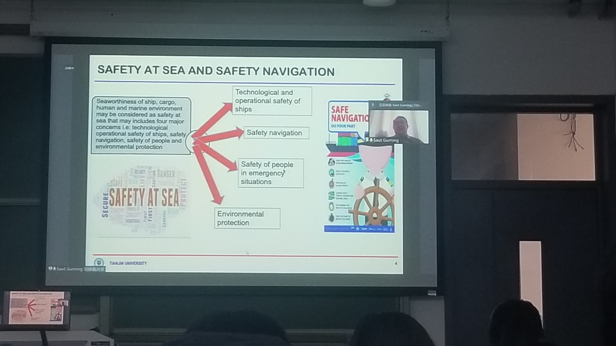 本次讲座旨在增强中国与东盟高校师生之间的学术交流,提升天津大学海洋学院国际影响力。Saut Gurning以航海安全和海上事故分析为主题,从全球海事安全制度、法律体系框架、远程引航的主要问题和岸基引航的安全系数和安全评估,安全评估仪器等方面做出了阐述。Boonsit Yimwadsana讲解了“信号与系统”中使用MATLAB进行傅里叶变换的方法。这些讲座报告有助于推动中国-东盟高校间的涉海学科教育交流和教学合作,参与讲座的学生获益匪浅,提升了国际化视野。