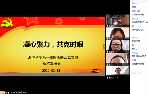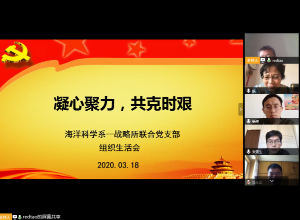 (通讯员 杨伟)2020年3月18日,海洋学院海洋科学系与战略所联合党支部开展“凝心聚力,共克时艰”的线上组织生活,全体党员同志参会,会议由聂红涛同志主持,副院长巩乐同志列席参加。会上党员同志们认真学习中央关于疫情防控的系列文件与会议精神,学习在疫情期间涌现出来的先进典型和感人事迹,就如何在抗疫期间担当作为、履职尽责等进行了深刻思考与交流。