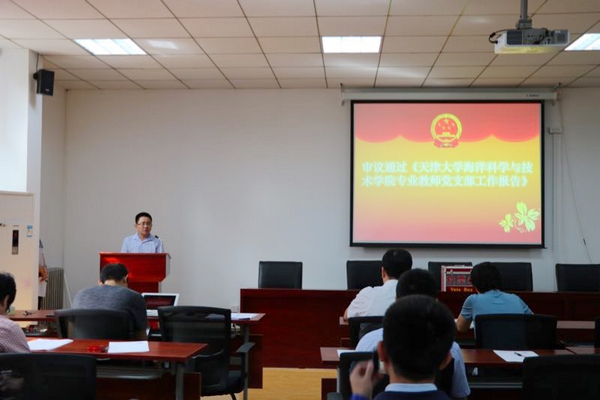 本次支部党员大会在庄严的国歌声中开始,刘嘉玥老师首先介绍了本次大会的出席情况,田文杰老师宣读了大会详细议程。支部书记张亮向支部全体党员和参会领导做了《天津大学海洋科学与技术学院专业教师党支部工作报告》(简称《工作报告》),他总结了专业教师党支部在过去两年内的工作思路与特色,系统梳理了支部工作的成绩与不足,并对未来支部工作提出了中肯的建议,全体党员审议并通过了《工作报告》。