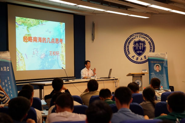 (通讯员 王楷然、孟雯)2018年9月18日,中国人民解放军海军军事学术研究所原所长、研究员,解放军战略规划咨询委员会委员,中国国际战略基金会高级研究员,军队职能装备军民融合协会首席顾问、南海问题研究学者王校轩先生做客北洋大讲堂、海洋时政大讲堂,为天津大学师生带来一场题为《经略南海的几点思考》的讲座,天津大学海洋科学与技术学院党总支副书记何立乾及国家海洋局的有关同志列席嘉宾。王校轩研究员以我国曾经创造过光辉灿烂的海洋文明但也经历过有海无防的屈辱历史开场,吸引了全场师生的强烈兴趣。关于经略南海,他从三个方面娓娓道来,一是经略南海的必然缘由,二是经略南海的历史机遇与制约因素,三是经略南海的重要举措。
