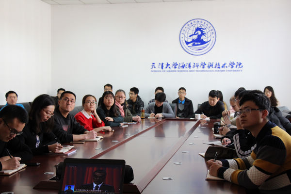 (通讯员 高荪培)2018年3月5日上午9时,十三届全国人大一次会议于北京隆重开幕,国务院总理李克强作政府工作报告。海洋学院全体师生通过报纸、网络、电视、广播等媒体收听收看政府工作报告,第一时间认真学习“两会”精神。海洋学院行政党支部全体党员和学生骨干于第八教学楼307室共同收看了十三届全国人大一次会议开幕式直播,认真学习领会大会精神,学院党总支副书记凌国维、副院长王军、巩乐与师生一同收看。
