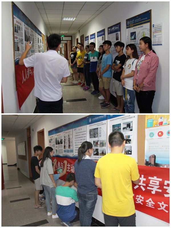 9月22日,学院选取安全建设规范实验室图片以及安全防护知识海报在学院一层大厅进行展示,学院部分本科生及研究生进行参观,参观过程中由海洋学院实验技术系列教师吕志伟老师结合海洋学院实际情况对规范要求进行讲解,向同学们强调操作规程,讲授佩戴防护设备注意事项,希望学生在实验过程中能做到看懂危险标识,了解潜在危险,懂得规避危险,做好安全防护。活动张贴了本次安全文化周活动主题条幅,充分调动了师生的主观能动性,学院师生积极在条幅上签写防护实验室安全标语,共同肩负起防护实验室安全的责任。