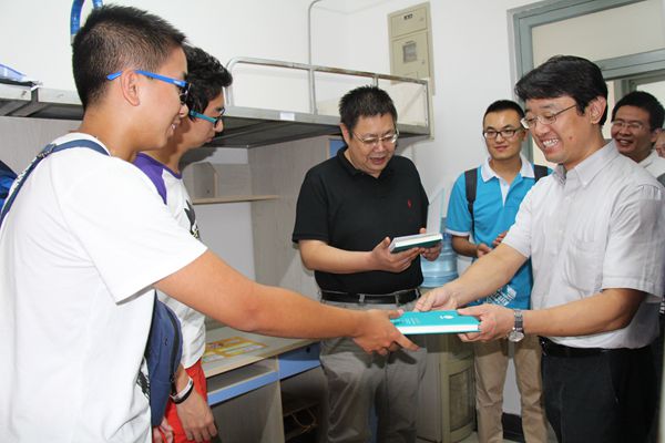 走访探望过程中,学院两位领导每进入一个宿舍,都会晃晃床,摸摸被子,询问新生是否安排妥当、对学院安排是否满意。翟院长与牛院长亲切地与学生交谈,叮嘱学生要快速适应大学生活,学习生活中要注意人身和财产安全,在大学期间养成良好的生活、学习习惯,如果有困难直接找学院,学院将全力帮助解决。两位领导告诉大家,能相聚海洋学院就是一种缘分,在海洋学院一定要精诚团结,互帮互助,共同提高,形成一个良好的氛围。新生也与两位领导热情的回应与交流。两位领导还亲自把学院精心择选的书籍《活出生命的意义》赠送给每位新生,新生看到书籍与赠言,表示十分喜欢。