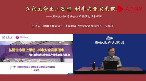6月17日15时,中国工程院院士、清华大学公共安全研究院院长范维澄以“弘扬生命至上思想 树牢安全发展理念 用科技创新为安全生产提供支撑和保障”为主题在“云课堂”讲解。范维澄院士是中国火灾科学与安全工程的专家,在长期的研究中,致力于把高科技引入火灾科学的研究和火灾防治,为火灾防治提供新的思想、理论和方法,成为中国火灾科学研究的开拓者。