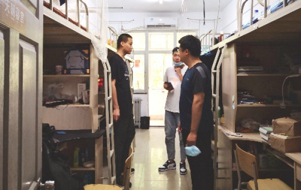 走访中,每到一个宿舍,靳楠书记总是先问问大家回到宿舍适应不适应,生活方便不方便,有没有什么困难需要学院帮忙解决;也会询问大家居家学习生活情况,了解大家对线上教学工作的建议以及与同学们交流返校后的学习计划与安排。靳楠书记和辅导员老师们也分别嘱咐提醒同学们,要遵守学校的防疫工作要求,注意勤通风,勤洗手,要积极调整作息,锻炼身体;要注意空调温度,节水节电,避免浪费;如果身体有不适,及时与辅导员老师联系。在走访中,老师们也鼓励即将迎来开学“考试周”的同学们好好复习,相信大家都能考出好成绩。