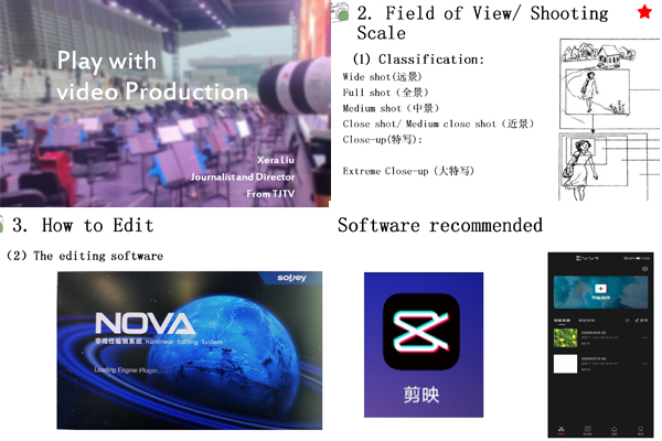 天津电视台资深编导刘天文讲授主题为《Playing with Video Production》的讲座,为师生讲述关于视频制作和后期编辑的要领,从立意选材、布光布景、拍摄角度、配乐配图等方面为大家答疑解惑。刘老师图文并举、声情并茂的讲座给师生们带来了一场干货满满的视听盛宴。