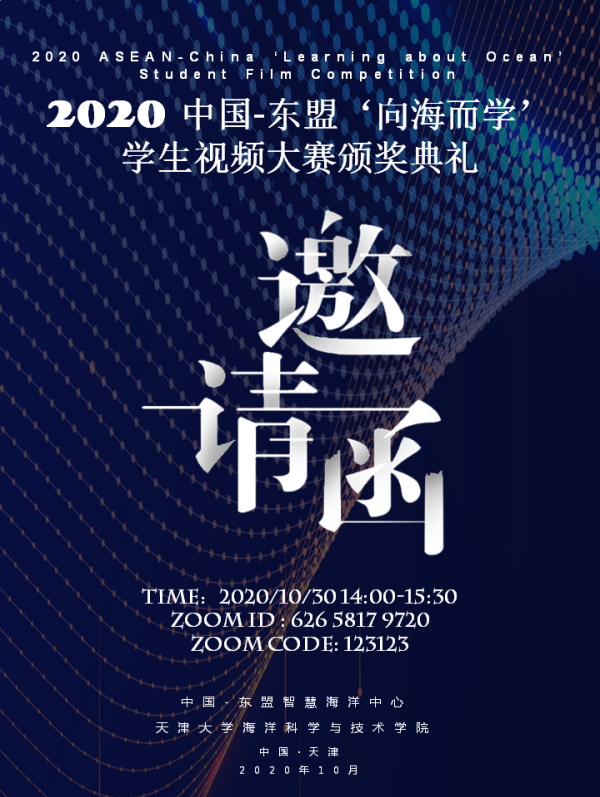 为表彰在本次2020中国-东盟“向海而学”学生视频大赛中取得优异成绩的各参赛队伍,增进中国-东盟高校间的友谊,提升海洋科普热情,加强两地人文交流。根据中国-东盟智慧海洋中心工作流程和既定时间安排,组委会将于2020年10月30日(周五)下午14时(北京时间),线上举办2020中国-东盟“向海而学”学生视频总结汇报会暨颁奖典礼。现将有关安排通知如下: