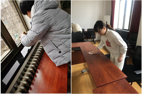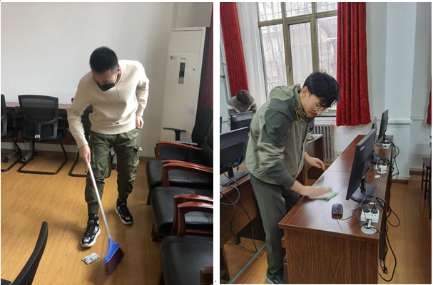 张文硕同学清理教室地面 马牧原同学擦拭实验室桌面