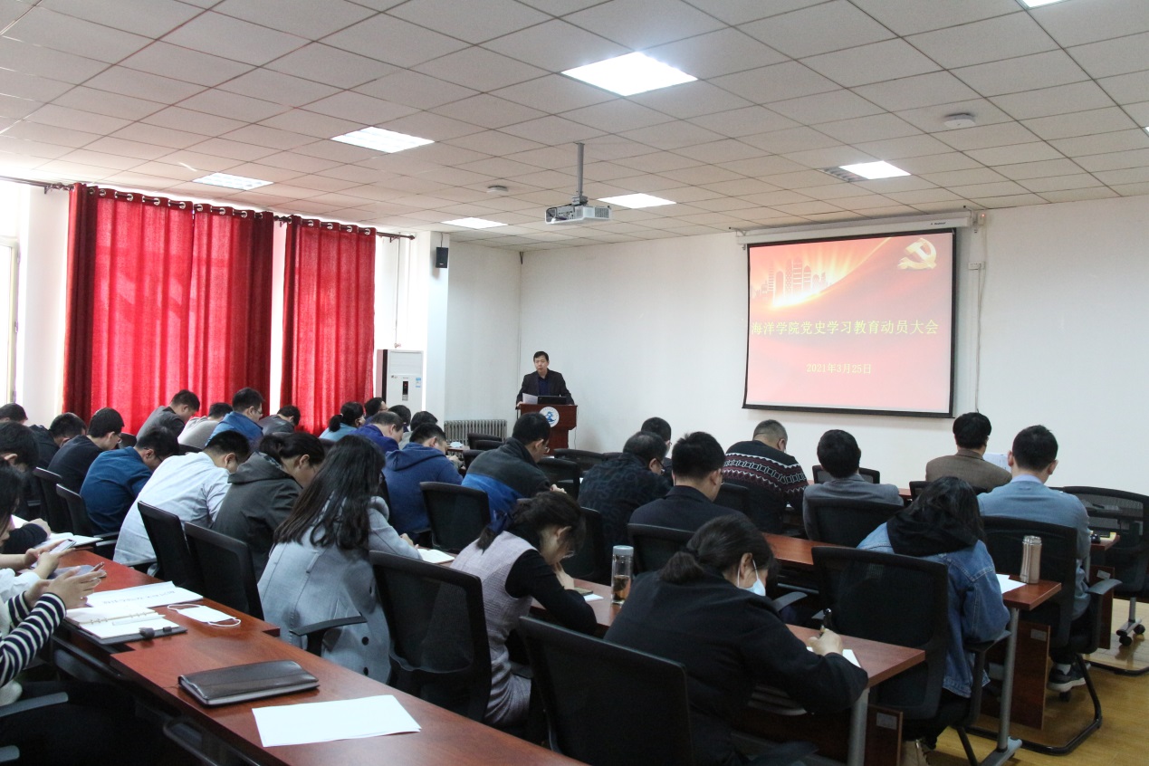 (通讯员:王悦媛)为深入贯彻落实习近平总书记在党史学习教育动员大会上的重要讲话精神和学校党委工作部署,3月25日下午,天津大学海洋学院在卫津路校区第八教学楼319会议室召开党史学习教育动员大会。海洋学院党委书记凌国维,院长翟京生,副书记靳楠,副院长徐德刚、苏荣欣以及学院全体教职员工共计60余人参加了动员会,副院长巩乐主持会议。