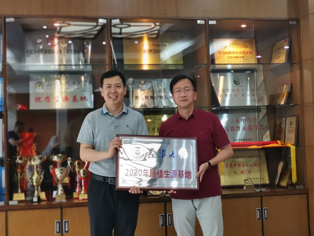 (通讯员 国玮琦)2021年6月26日,天津大学“2020年最佳生源基地”授牌仪式在北京第四中学举行。天津大学北京招生组负责人、海洋科学与技术学院党委书记凌国维,海洋科学与技术学院副院长巩乐、北京招生组吴晓刚等出席授牌仪式并进行了招生宣传。北京市第四中学校长马景林、校长助理李靖参加授牌仪式。