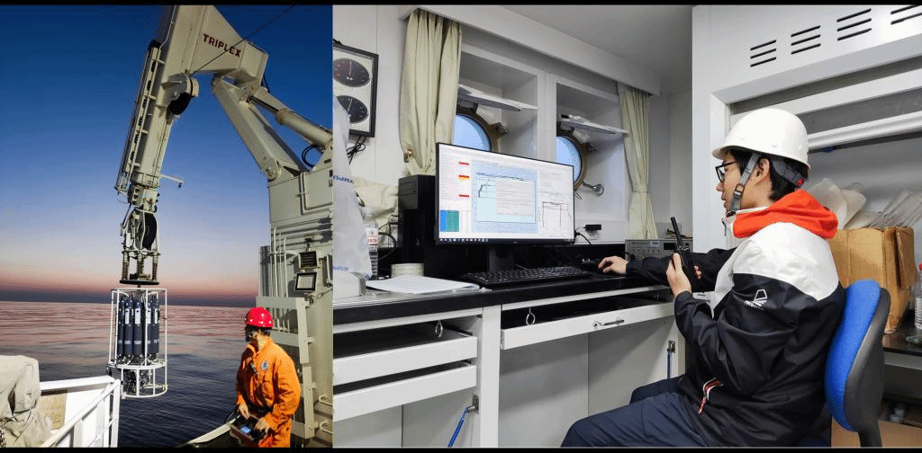 图3:于廉涛(右)与船员(左)密切配合操作CTD