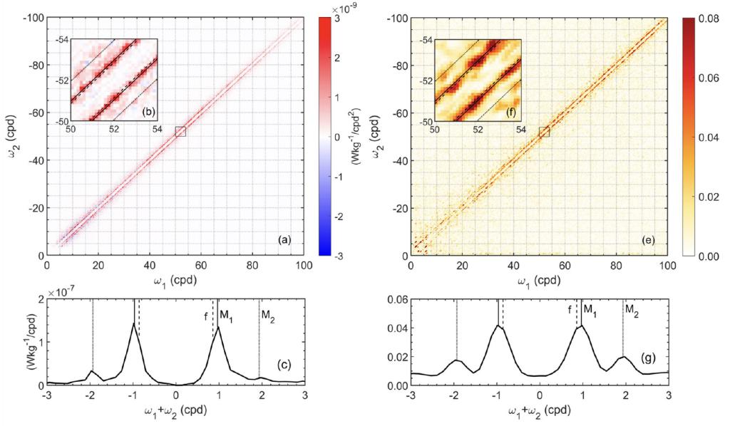 图1双相干谱证实M1次谐波与高频内波之间的能量传递与相位耦合