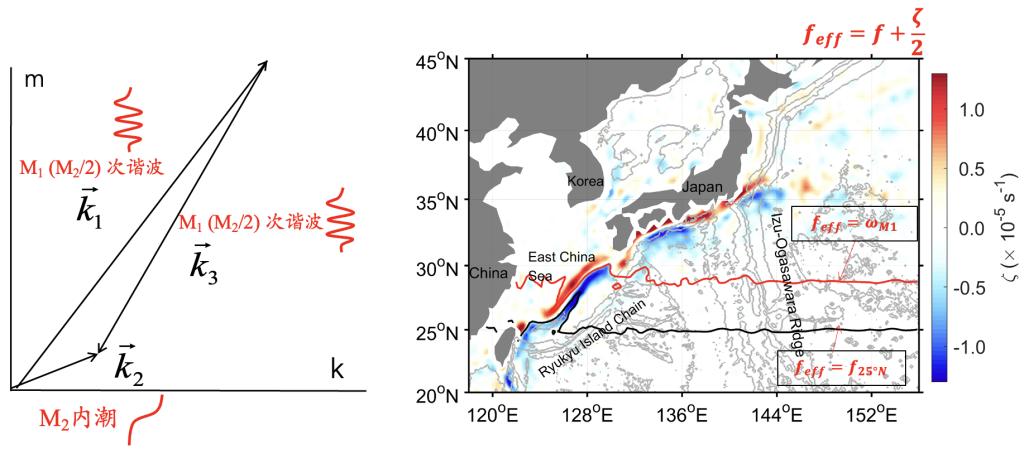 研究团队前期已基于数值模拟与东海现场观测,量化了PSI机制对东海M2内潮降尺度能量输运的作用,并发现了黑潮等背景流可以通过改变背景涡度场的方式改变有效科氏频率,从而影响PSI发生效率的调制机制(图2)。最近的研究是该前期工作的延伸,相关工作共同揭示了一个更完整的内潮能量传输通道,对认识海洋内部混合机制、解释海洋混合分布特征等有积极意义。研究团队下一步将继续围绕海洋能量串级与多尺度相互作用等方面开展深入研究。