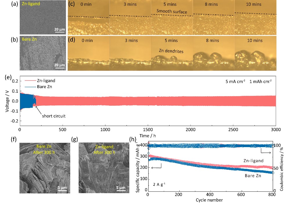 图2 EDTA抑制枝晶的作用效果。(a)含EDTA的锌片表面的SEM图;(b)不含EDTA的锌片表面的SEM图;(c-d)原位光学显微镜图观察枝晶生长过程;(e) Zn//Zn对电池的剥离/沉积时间-电压曲线;(f-g)循环300小时后的锌片表面的SEM图;(h)在2 A g-1下,Zn//NVO全电池的循环充放电曲线。