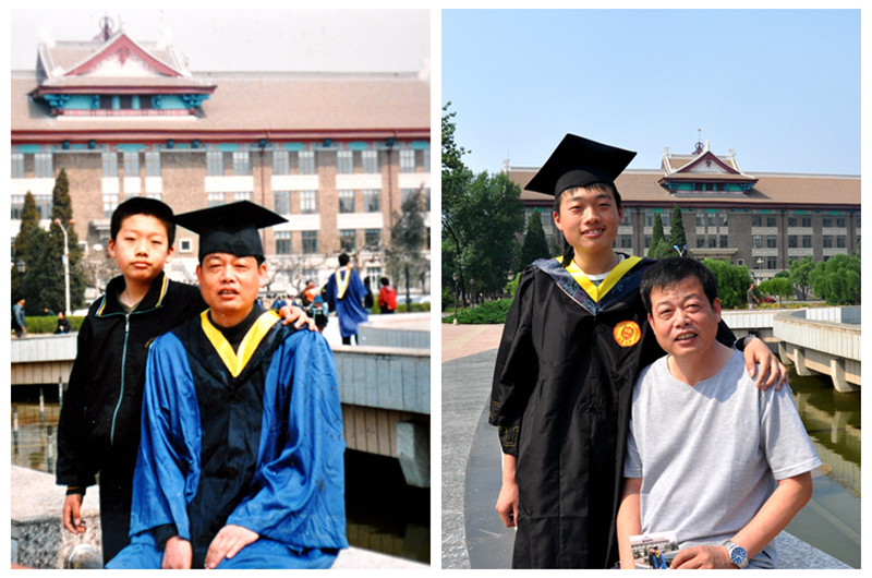 时隔13年,柴澍靖与父亲再次在天津大学第九教学楼前合影(右图)