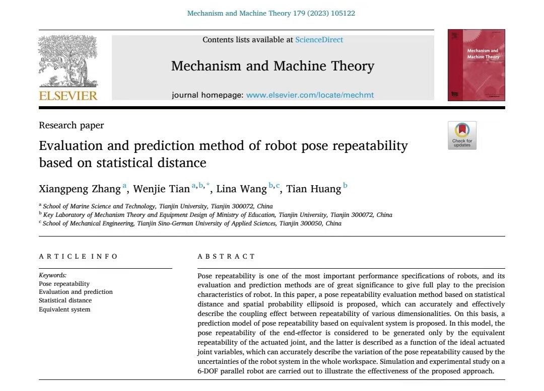 随着人类海洋活动的深入,越来越多的机器人被应用到海洋领域,机器人性能直接决定其可执行任务类型。机器人位姿重复性是评价机器人性能的一个关键指标,研究位姿重复性评价及预测对机器人运动控制、性能提升以及工程应用具有指导意义。近日,天津大学海洋学院研究团队在机器人学顶级期刊《Mechanism and Machine Theory》(SCI 1区Top)上发表一篇题为“Evaluation and prediction method of robot pose repeatability based on statistical distance”的研究论文。本文第一作者为我院2021级硕士研究生张相鹏,通讯作者为海洋学院田文杰副教授。