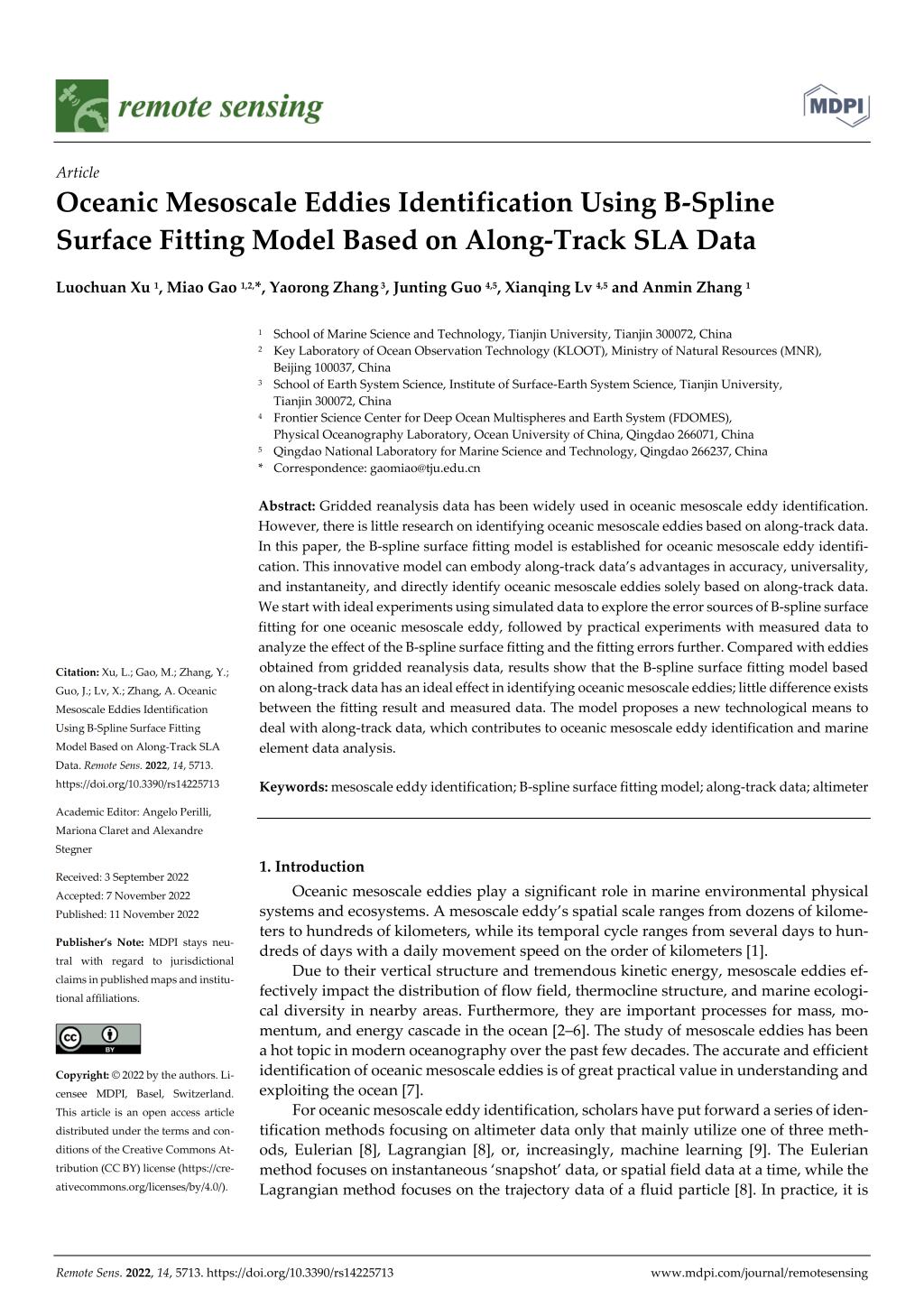 Xu, L.; Gao, M.; Zhang, Y.; Guo, J.; Lv, X.; Zhang, A. Oceanic Mesoscale Eddies Identification Using B-Spline Surface Fitting Model Based on Along-Track SLA Data. Remote Sens. 2022, 14, 5713. https://doi.org/10.3390/rs14225713