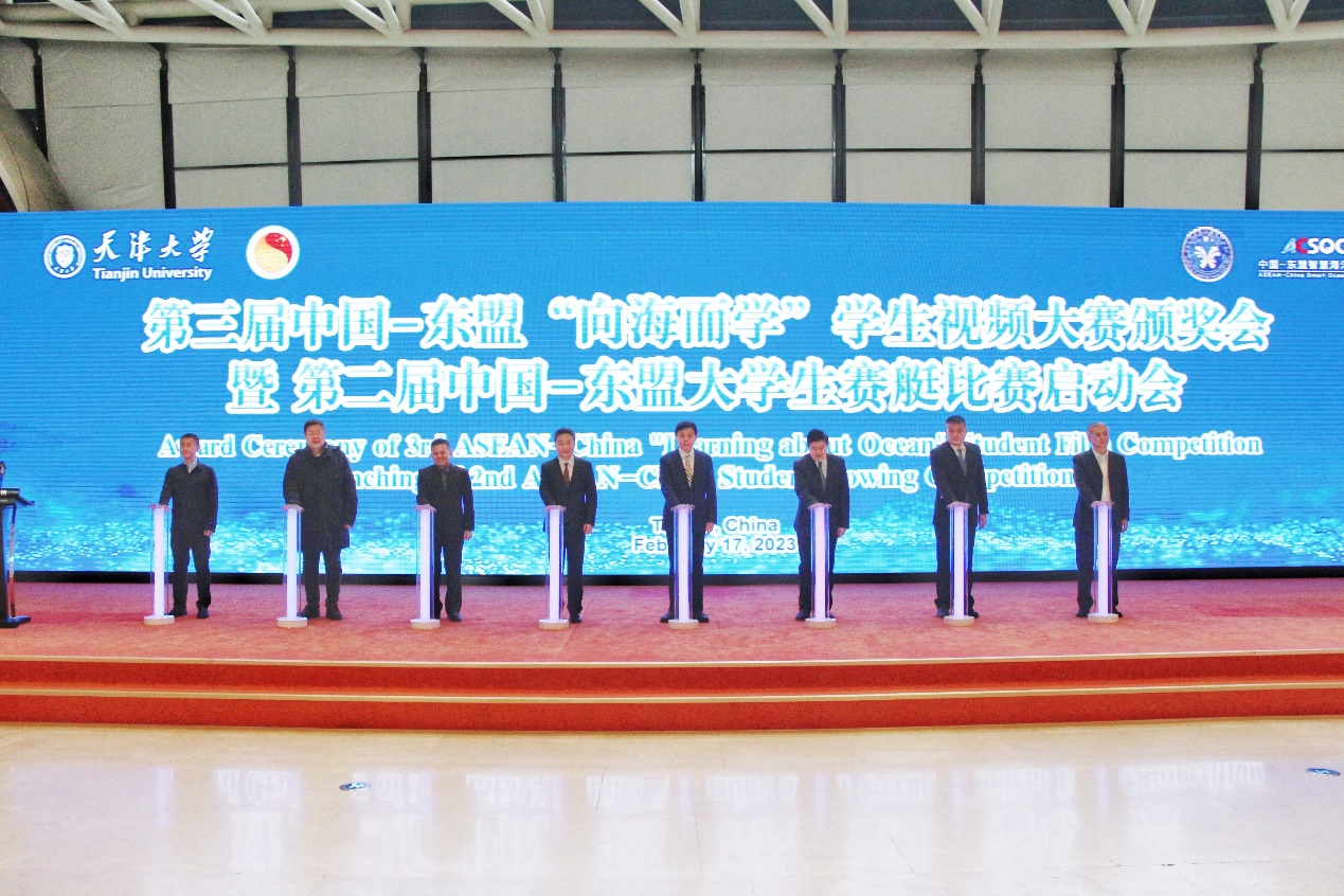 2023年2月17日,中国-东盟第三届“向海而学”学生视频大赛颁奖典礼暨第二届大学生赛艇比赛启动会在国家海洋博物馆以线上线下形式举行,是中国—东盟中心和天津大学共同举办的中国-东盟高等教育合作论坛的重要组成。中国—东盟中心秘书长史忠俊阁下及教育文旅部副主任李亚莹,泰王国驻华大使阿塔育阁下及夫人、泰王国驻华大使馆公使衔参赞陈善意,印尼驻华使馆教育参赞李健先生等东盟使馆、国际组织代表,及自然资源部南海局副局长谢健、海南热带海洋学院副校长王道儒、中新生态城管委会副主任孙晓峰、天津市学生赛艇联盟名誉主席沈家聪、天津市冬水中心副主任赵奉键、天津大学海洋学院院长翟京生、国家海洋博物馆馆长黄克力以及专家学者、参赛选手和师生代表等出席了本次视频大赛颁奖典礼和赛艇比赛启动会。会议由天津大学国际合作与交流处副处长魏有香主持。