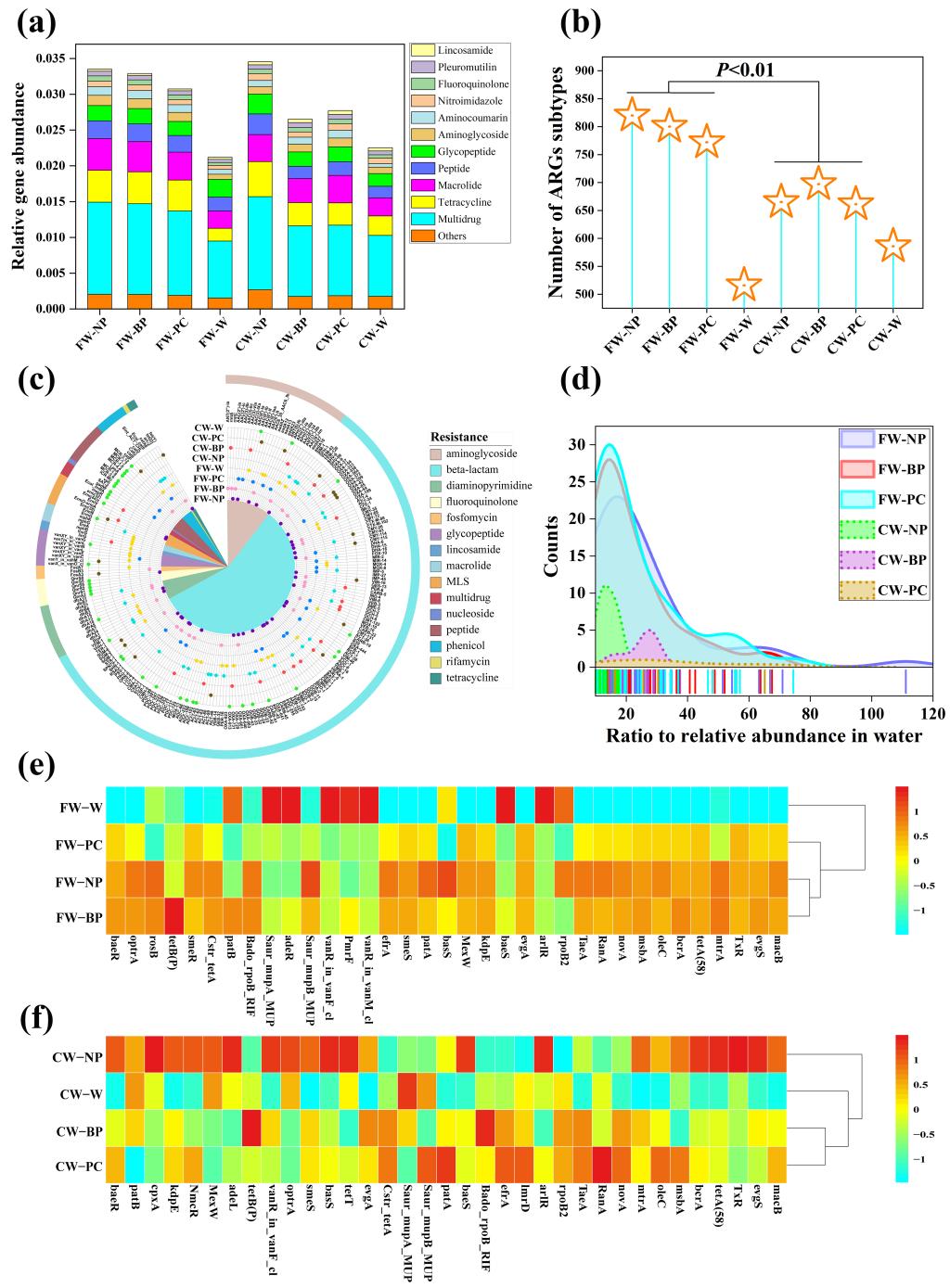 作为微生物和抗生素抗性基因等基因元件的载体,全球范围内每年有巨量包括塑料和非塑料在内的固体垃圾穿越河口汇入海洋。在实地河口区,不同类别塑料以及非塑料表面附着的微生物组的异质性及潜在环境风险差异尚不明晰。本次研究基于宏基因组测序及分析技术,考虑空间位置和基质类别,对实地暴露于海河河口区两端河水和近岸海水环境中代表性非生物降解塑料、可生物降解塑料和非塑料基质表面的微生物群落、抗生素抗性基因、毒力因子和可移动遗传元件进行了系统分析(图3)。研究结果警示在河流和近海环境中由传统非生物降解塑料引发的生态风险需予以特殊关注,同时强调由陆源输送的塑料等固体垃圾向下游海洋环境输送的微生物风险需引起重视。2021级硕士赵鑫海为本研究成果第一作者,牛志广教授、马永正讲师为指导老师。