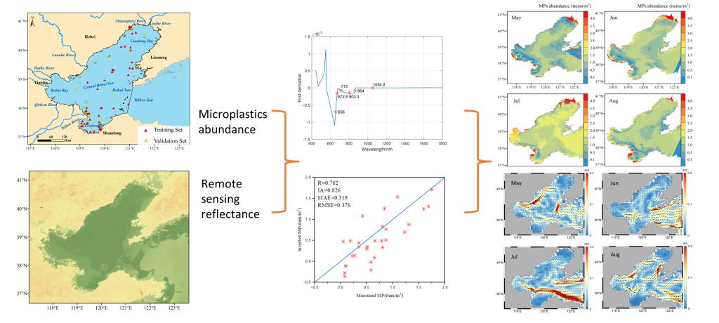 微塑料作为一种新型污染物,对海洋生态系统和人类健康产生巨大风险。传统上,海洋微塑料是通过现场空间和时间采样调查来检测的,其中拖网是针对微塑料的主要技术。但这种观测需要花费大量时间、人力、物力,且调查范围十分局限,难以满足常态化、大范围、连续动态监测的需求。本研究利用2016-2017年渤海微塑料现场调查数据和相应的卫星反射率数据进行建模,采用了连续投影法、相关系数法和遥感指标法三种特征变量选择方法建立多元回归模型,通过对比精度评价指标,选定基于连续投影法的最优模型,应用于2022年3-11月的渤海微塑料丰度反演及时空分布分析。研究结果表明,在时间上微塑料分布存在明显的季节变化,夏季的丰度高于春季和秋季,这与降水和地表径流密切相关。在空间上陆源排放和环流模式决定了微塑料在近岸和河口地区积累和扩散。研究证实,卫星遥感技术在监测海洋微塑料方面有很大的潜力,还需加强对海洋微塑料的实地监测,为遥感算法的发展提供数据支持。2021级硕士洪萍萍为本研究成果第一作者,马永正讲师、张殿君副教授、牛志广教授为指导老师。