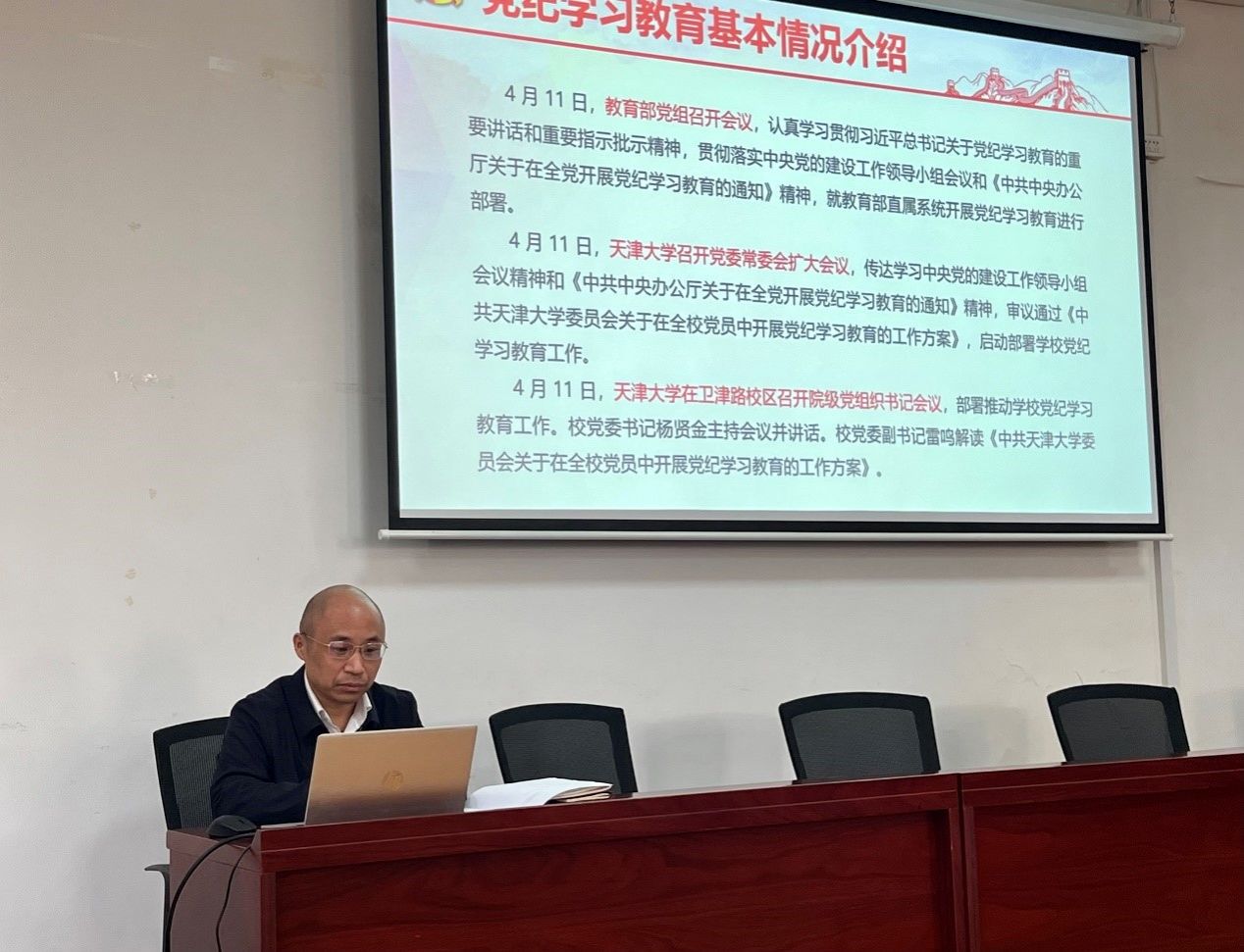 单小麟向学院全体党员传达了天津大学院级党组织书记会议精神及天津大学党纪学习教育工作方案,详细解读了学院党纪学习教育工作方案。单小麟强调,落实落细党纪学习教育,一是抓住学习重点。坚持逐章逐条学、联系实际学,抓好以案促学、以训助学,教育引导党员干部准确掌握其主旨要义和规定要求,进一步明确日常言行的衡量标尺,用党规党纪校正思想和行动,真正使学习党纪的过程成为增强纪律意识、提高党性修养的过程。二是要压实领导责任。领导班子和党员领导干部带头学习,推动党员干部高质量完成党纪学习教育任务。加强宣传引导,力戒形式主义,以良好作风保证党纪学习教育走深走实。三是要坚持两手抓两促进。把开展党纪学习教育同落实党中央重大决策部署,推动学校、学院重点工作紧密结合起来,使党纪学习教育每项措施都成为促进中心工作的有效举措,切实防止“两张皮”。