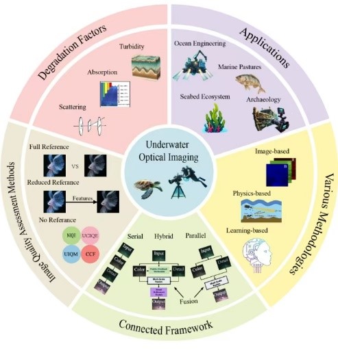 在水下应用中,高性能光学成像技术的作用尤为关键,特别是在环境监测、资源勘探和科学研究等领域。例如,海洋生态监测中先进的光学成像技术,在自主水下航行器(AUV)或无人水下航行器(UUV)上配备光学成像系统,可以实时、准确地观测复杂的海底生态系统。然而,由于水体固有的物理特性,光线在传输过程中会受到各种退化因素的影响,显着降低图像质量。光散射导致图像模糊和细节对比度降低,光吸收导致图像发生色偏,严重影响颜色的真实性。这一退化现象凸显了发展高效图像恢复算法的需求,以有效恢复图像质量。级联框架作为一种有效的解决方案,通过集成多个模块,如色彩校正、细节增强和多特征融合等,展现出比传统的直接复原或端到端恢复方法更为显著的优势。