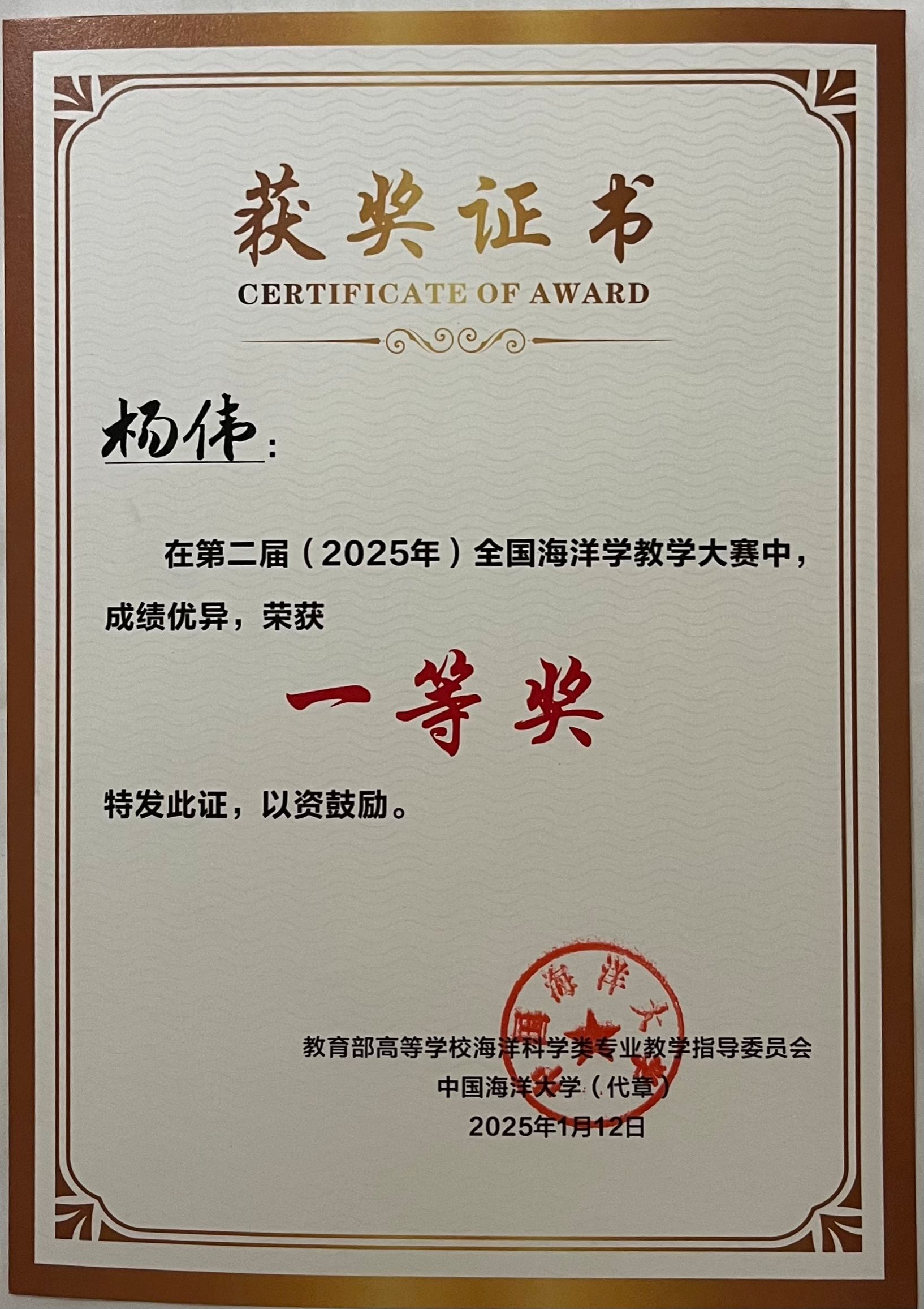 (通讯员:刘永静)2025年1月11日-12日,由教育部高等学校海洋科学类专业教学指导委员会、中国海洋大学海洋与大气学院和国家级海洋学课程虚拟教研室主办,广西大学海洋学院承办的第二届全国海洋学教学大赛在广西大学举行。我院海洋科学系杨伟副教授经过课程说课和现场教学等综合展示,荣获大赛一等奖。