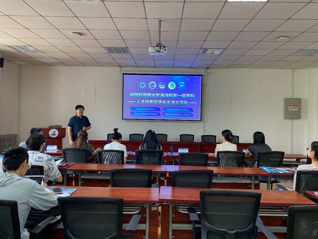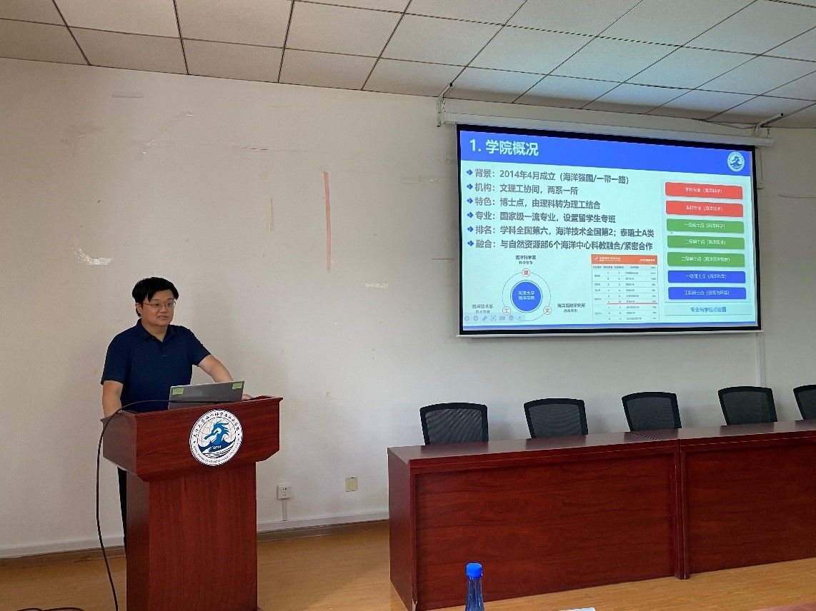 (通讯员:杨梦昕)为进一步深化国内重要涉海研究院与高校科教融合实质性合作,共同推动人才培养、学生就业等工作高质量发展。6月6日下午,海洋学院在天津大学卫津路校区第八教学楼319室举办中科院涉海研究院所招宣会。中国科学院南海海洋研究所人事教育处副处长李丹,中国科学院南海海洋研究所人事教育处教育主管杨敏,中国科学院烟台海岸带研究所研究生部主任付玉芹,中国科学院海洋研究所研究生部副主任孙永坤,中国科学院深海科学与工程研究所人事教育处业务主管李佳津,中国科学院深海科学与工程研究所人事教育处业务主管段晚晴,海洋学院教师代表和学生代表参会。会议由学院党委副书记靳楠主持。
