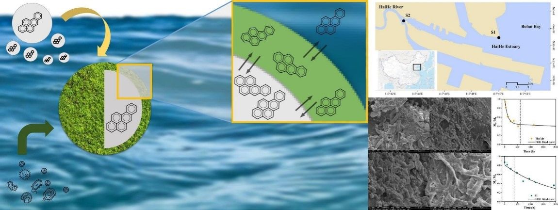 微塑料(MPs)能够成为疏水性有机化合物(HOCs)在水生环境中迁移的载体,但真实环境中塑料表面定植的生物膜如何影响MPs中HOCs的归趋尚未明确。基于此,研究团队将预吸附苯并[a]芘(BaP)的原始聚乙烯(PE)颗粒原位部署在渤海湾海河口80天,研究其解吸行为。结合实验室和原位实验,验证了在不同环境条件下,颗粒内扩散是直径2 mm的球形PE-MPs中BaP解吸过程的限速步骤。生物膜通过阻碍解吸和改变微塑料表面性质,可能在解吸过程中发挥了关键作用,从而导致在本研究的时间尺度下,原位解吸过程出现明显的滞后现象。此外,研究表明生物膜中微生物对PE及BaP具有潜在的降解能力,这种降解作用能够驱动BaP的持续解吸过程。本研究揭示了生物膜与MPs-HOCs的相互作用及其对HOCs环境归趋的影响。