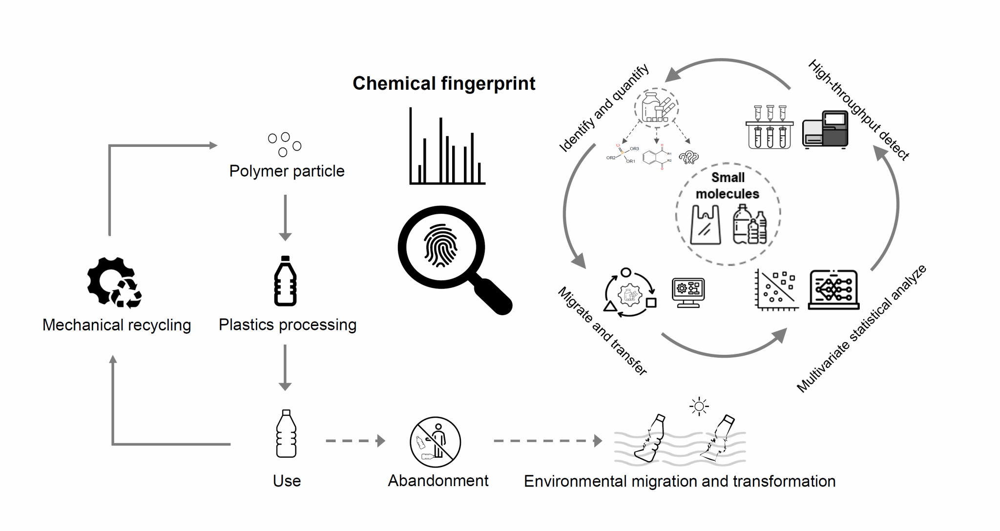 由于(微)塑料在物质流动和环境中的迁移和转化通常伴随着其宏观形态和表面特性的变化,因此从宏观上充分了解(微)塑料的迁移和转化过程是具有挑战性,这也增加了塑料和塑料添加剂的管理难度。基于前期相关研究基础,研究团队提出塑料的“化学指纹”概念,将与塑料有关的有机小分子的特征(种类、浓度和比例)定义为塑料的化学指纹,并在此基础上讨论了追踪塑料的策略和挑战。本研究强调,化学指纹作为独特且唯一的身份标记物,为追踪塑料的全生命周期过程(如塑料的加工、使用、回收、废弃和环境老化等),提供了潜在的可能。