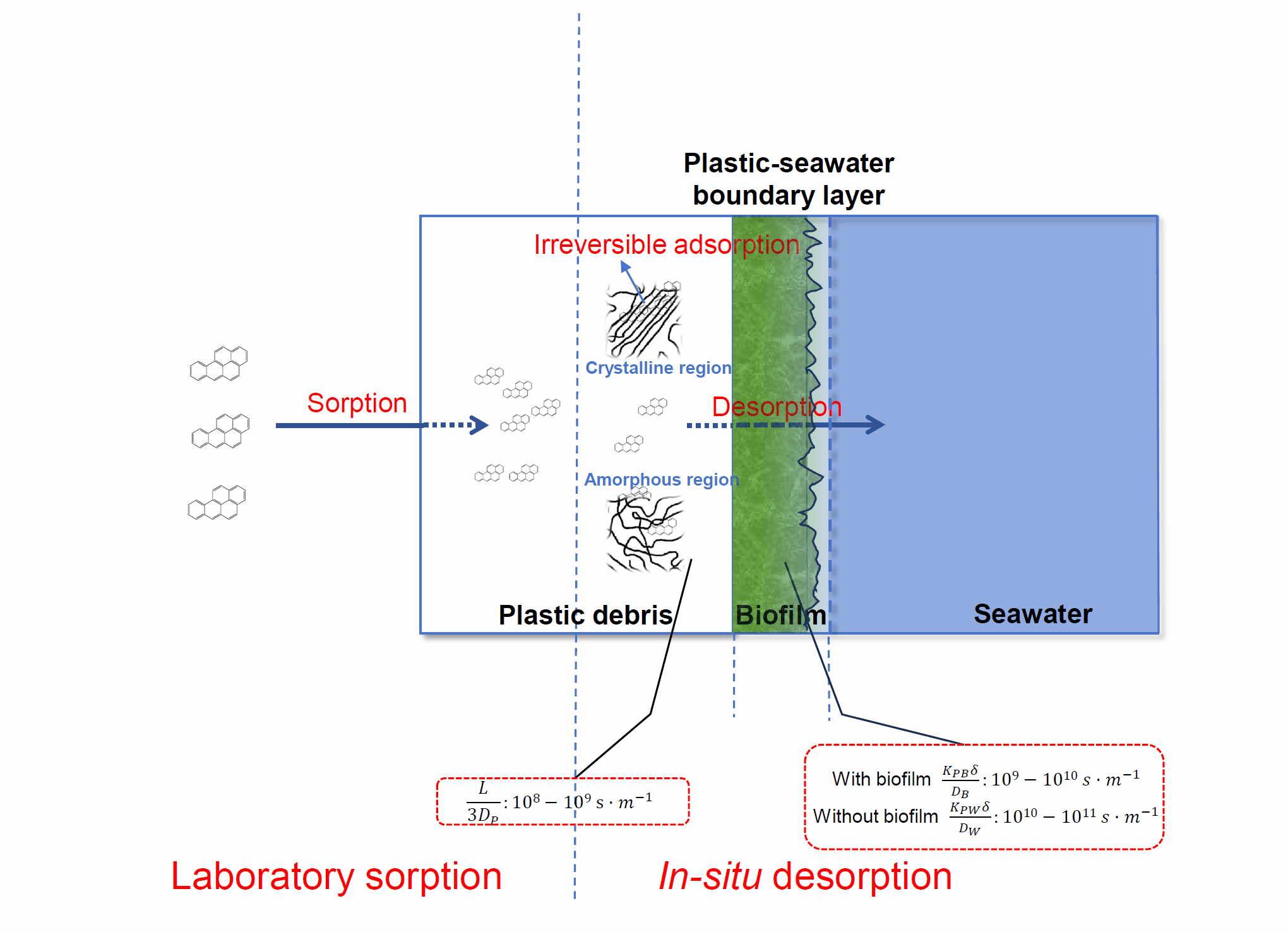 为了进一步研究海水环境下附着生物膜对微塑料复合污染物解吸附的影响及解吸附动力学规律,研究团队将预吸附不同浓度的非极性污染物苯并[a]芘(BaP)的聚乙烯(PE)薄片原位部署在海河口,以研究自然生物膜定植条件下的解吸动力学。根据BaP从PE薄膜中的解吸动力学,通过构建平衡分配传质模型来描述在生物膜形成影响下非极性污染物从PE中的解吸过程。研究证明,生物膜作为塑料和水生环境之间的中间介质,并没有成为塑料中吸附的BaP的汇,而是通过降低BaP在塑料和边界层之间的分配系数,从而改变了BaP在边界层处的传质过程。此外,基于团队开发的扩散传质模型,预测了生物膜对PE中其他非极性和弱极性污染物归趋的影响。本研究强调了生物膜对真实环境下塑料中疏水性污染物解吸的影响,同时也为塑料中添加剂的浸出过程提供新的见解。