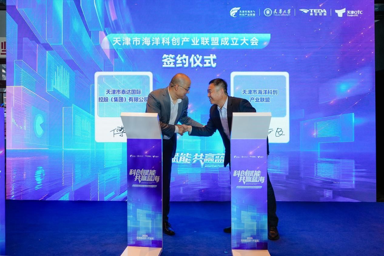 在全体与会嘉宾共同见证下,大会隆重举行联盟启动仪式、揭牌仪式及首批成员单位授牌仪式。天津市泰达国际控股(集团)有限公司与天津市海洋科创产业联盟于仪式上正式签署战略合作协议,将以资本赋能推动海洋产业创新发展。目前联盟已吸纳包括天津大学、天津理工等多所高校及科研院所,并汇聚了海洋电子信息、高端装备制造等领域的骨干企业,初步构建起“政、产、学、研、金”融合的创新生态体系。