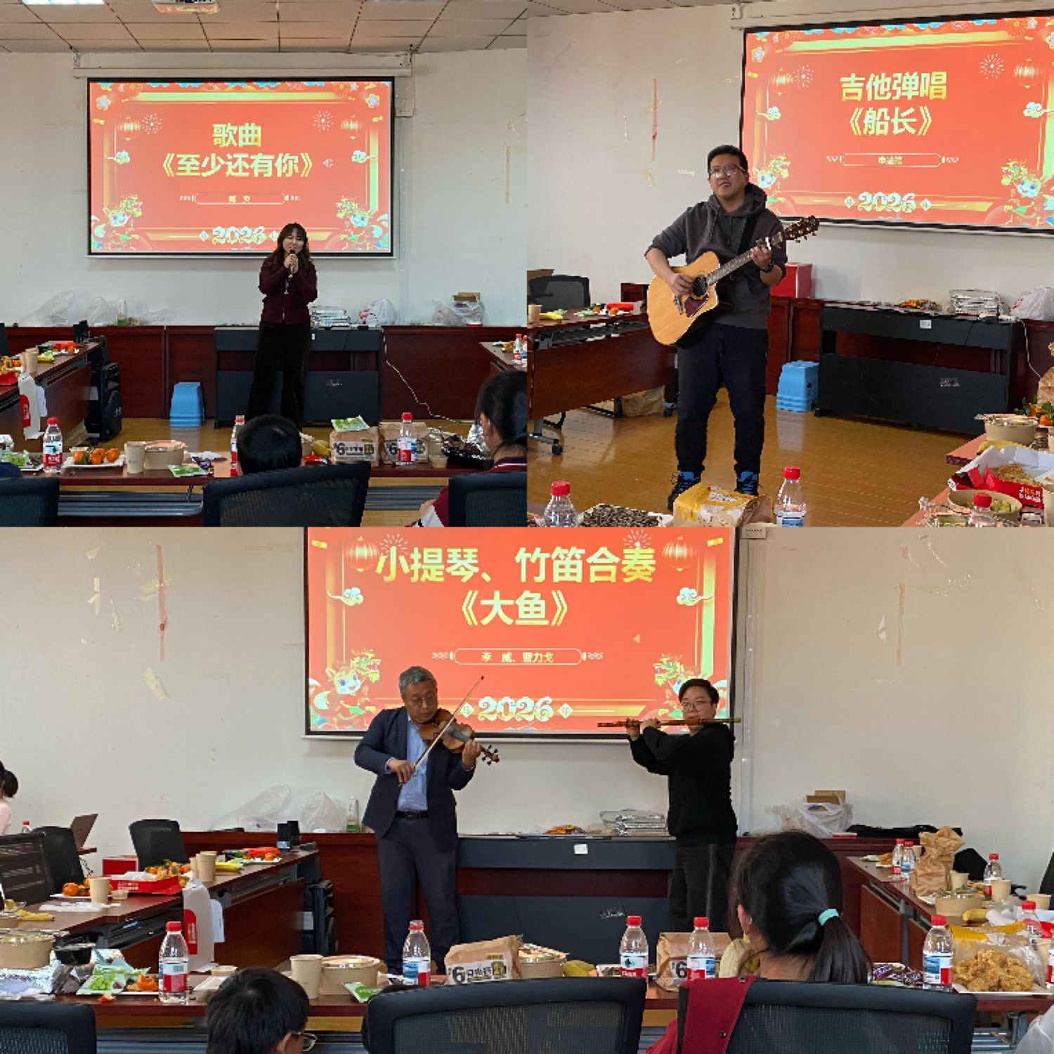 随后,迎新春联欢会正式开始,陈爽老师带来的独唱歌曲《至少还有你》优美动听、动人心弦;申凌皓老师的吉他演奏《船长》将说唱与乐声完美融合,演绎出充满青春活力的现代韵律;李威老师和曹力戈老师的合奏曲《大鱼》以悠扬婉转的小提琴搭配深情细腻的笛声,引得现场掌声不断。