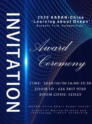 In recognition of the outstanding achievements of the participating teams in 2020 ASEAN-China ‘Learning about Ocean’ Student Film Competition,promoting the friendship between the universities of ASEAN and China,enhancing the enthusiasm for marine science popularization and strengthening the cultural exchanges between the two regions, according to the Schedule ofACSOC-SFC, the Summary conference and Award Ceremony of 2020 ASEAN-China ‘Learning about Ocean’ will be held online at 14:00 on 30thOctober, 2020.