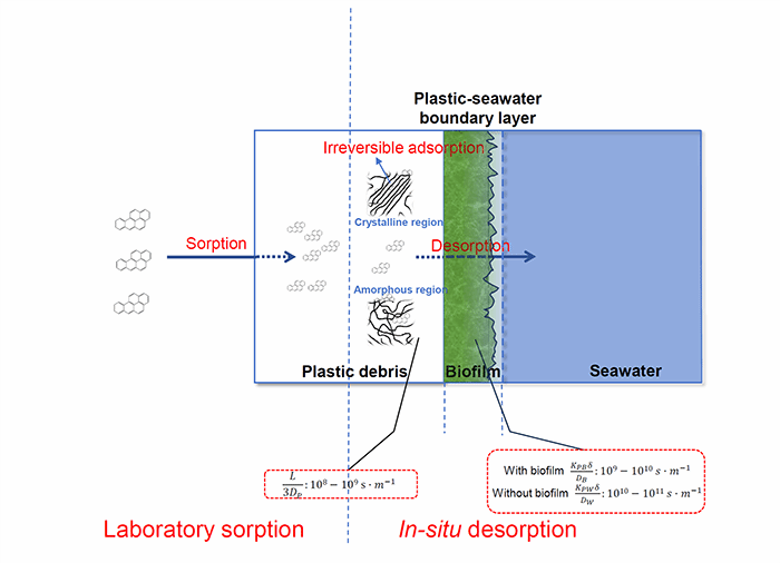 To further investigate the impact of biofilms on the desorption of microplastic composite pollutants and the kinetics of desorption in seawater environments, the research team deployed polyethylene (PE) sheets pre-adsorbed with different concentrations of the non-polar pollutant, benzo[a]pyrene (BaP), in situ at the Hai River estuary to study desorption kinetics under natural biofilm colonization conditions. Based on the desorption kinetics of BaP from the PE sheets, a mass transfer model was constructed to describe the desorption process of non-polar pollutants from PE under the influence of biofilm formation. The research demonstrated that biofilms, acting as an intermediary between plastics and aquatic environments, did not serve as a sink for BaP adsorbed in plastics. Instead, they altered the mass transfer process of BaP at the boundary layer by reducing the distribution coefficient of BaP between the plastic and boundary layer. Furthermore, based on the diffusion mass transfer model developed by the team, predictions were made regarding the impacts of biofilms on the fate of other non-polar and weakly polar pollutants in PE. This study emphasizes the influence of biofilms on the desorption of hydrophobic pollutants from plastics in real environments and provides new insights into the leaching processes of additives from plastics.