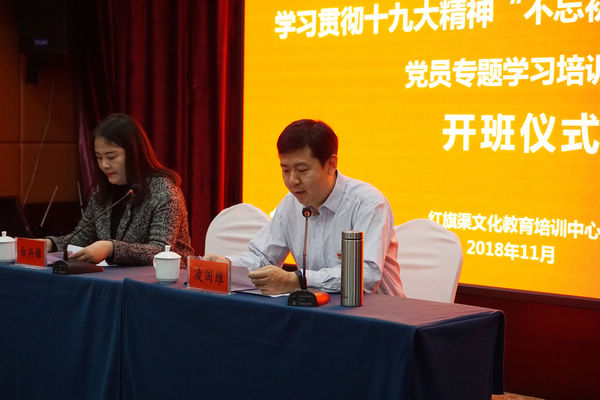 11月9日下午举行了开班仪式。红旗渠文化教育中心主任白兴雅致欢迎辞,她对培训班的举办表示祝贺,并介绍了林县的历史、红旗渠修建过程以及中心的发展情况。海洋学院党总支书记凌国维同志在讲话中指出,红旗渠是20世纪60年代林州人民在极其艰难的条件下,靠着一锤一铲两只手,从太行山腰修建的引漳入林工程,历时近十年,削平了1250座山头,架设151座渡槽,开凿211个隧洞,全长1500公里,被称为"人工天河"。红旗渠结束了十年九旱、水贵如油的苦难历史,孕育出"自力更生,艰苦创业,团结协作,无私奉献"的红旗渠精神。我们选择来到红旗渠参加培训,就是要学习这种精神,使之转化为我们“双一流”建设的精神源泉和不竭动力。他对学员提出了三点要求:一是要端正学习态度,在学懂弄通做实上下功夫;二是要深刻领悟红旗渠精神,做到学以致用;三是要将学习红旗渠精神与学习贯彻十九大精神和习近平新时代中国特色社会主义思想相结合。最后,凌国维同志为培训班学员代表王晨旭同志授班旗。