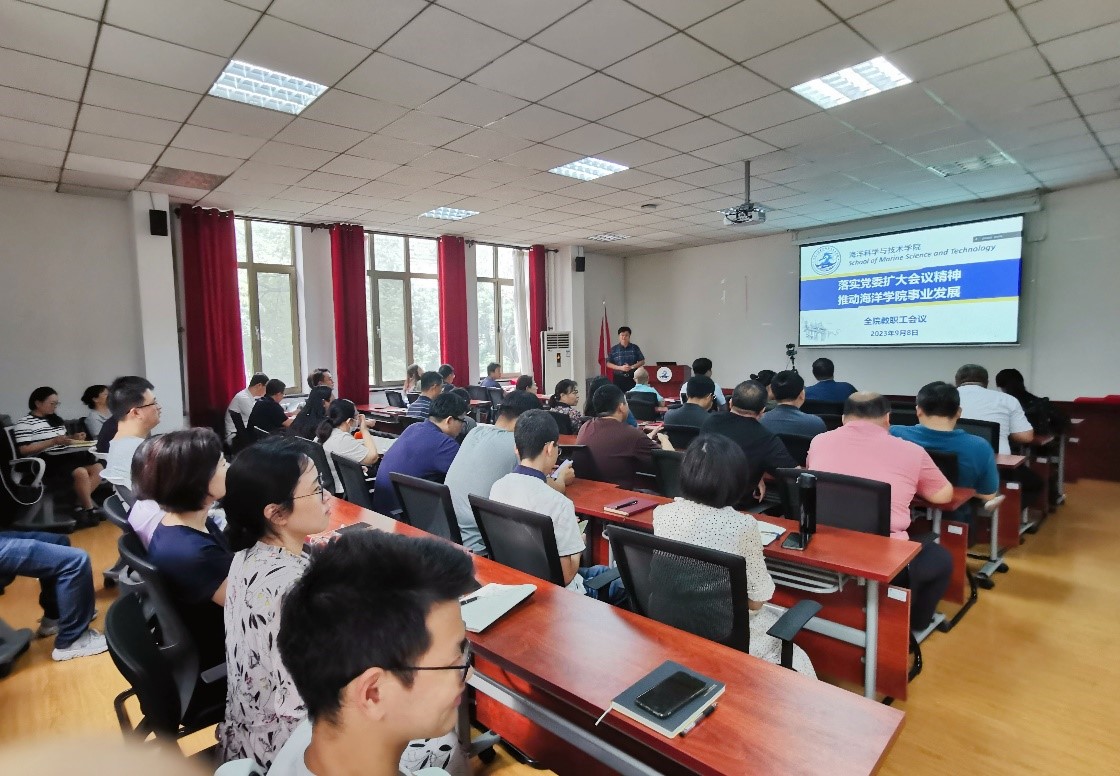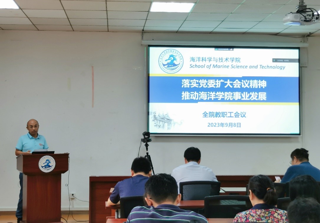 (通讯员陈美珠)为贯彻落实中共天津大学委员会十一届三次全体(扩大)会议精神,推动学院下半年事业发展各项工作,海洋学院于9月8日上午在学院319会议室组织召开全院教职工会议。海洋学院院长翟京生、党委书记单小麟及学院领导班子成员出席会议,全体教职工参加会议。会议由党委副书记靳楠主持。
