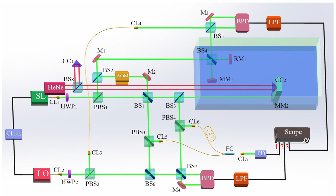 天津大学海洋学院声光探测团队提出了一种基于双光梳干涉的激光雷达系统,以实现精确的水下绝对距离测量。为了消除脉冲激光测量中的非模糊距离,采用了设计的脉冲编码策略,利用声光调制器实现对光信号的开关调制,从而实现对双光梳信号的编码,大大扩展水下测量的非模糊范围。这种组合在不牺牲采样率或测量精度的情况下,显著扩展了双光梳LiDAR的非模糊范围,在重复频率差为2 kHz的情况下,可以提高到约55 km,实现一次性精确的远距离探测。实验结果表明,在12 m的测量范围内,测距精度优于±15 μm。