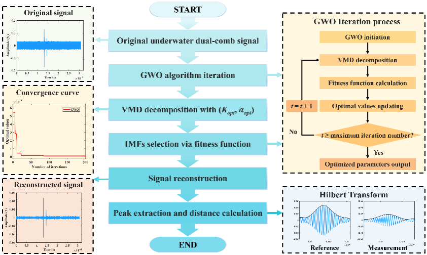 针对复杂水下环境下,双光梳LiDAR信号会受到环境干扰和系统噪声的影响的问题,团队提出了一种改进的变分模态分解(VMD)方案并适用于水下双光梳测距系统。通过考虑理想双光梳干涉信号的类高斯形状和高信噪比的特点,将灰狼优化算法(GWO)引入VMD进行参数优化,并对GWO的适应度函数进行了特殊设计。通过优化的VMD算法,将畸变的噪声干涉信号分解为一系列高质量的子信号,最终选择最佳适应度的子信号进行信号重构。对不同条件下双光梳信号的实验结果表明,该方法不仅能提高干涉图的信噪比,而且能同时恢复干涉图的高斯形状,能够扩展双光梳LiDAR的工作范围和对非理想环境的鲁棒性。