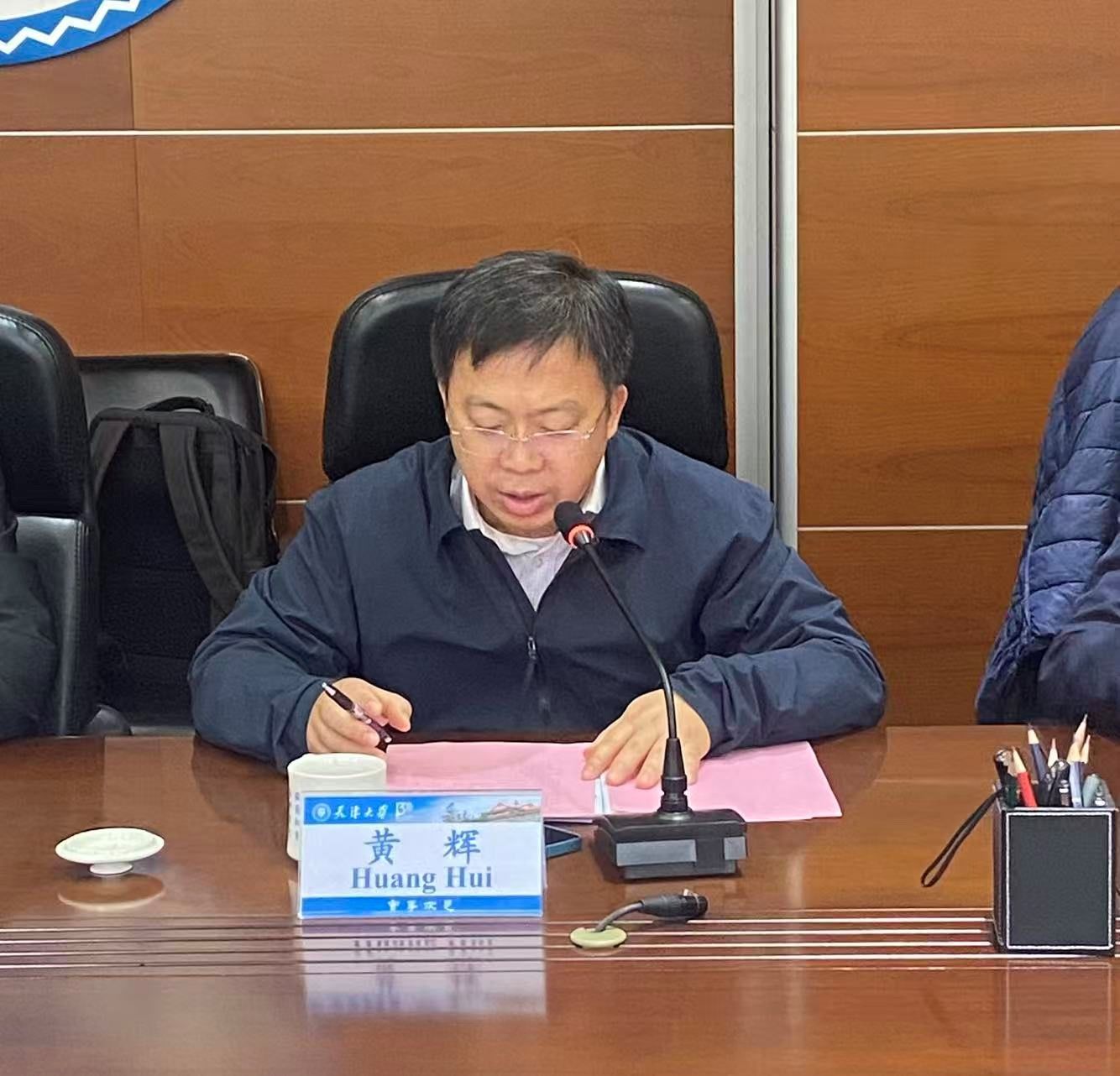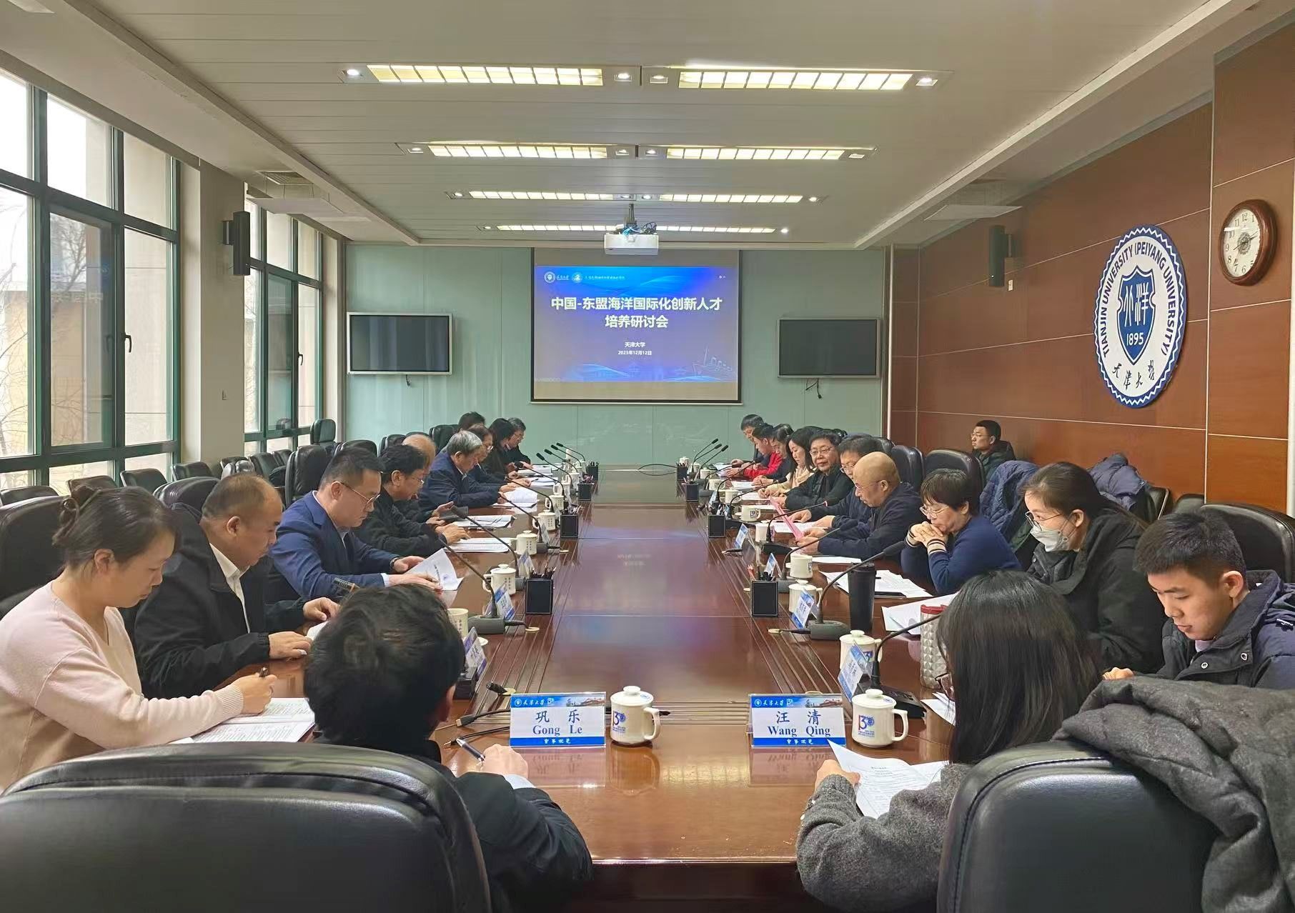 出席本次会议的天津大学领导有:天津大学校长助理黄辉, 海洋学院院长翟京生,教务处副处长夏淑倩,国际合作与交流处副处长魏有香,出版社原副社长韩振平。此外,海洋学院教师及留学生代表参加会议,本次会议由海洋学院党委书记单小麟主持。