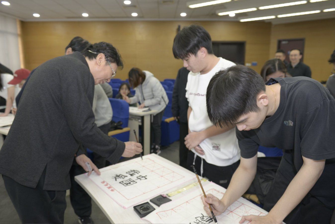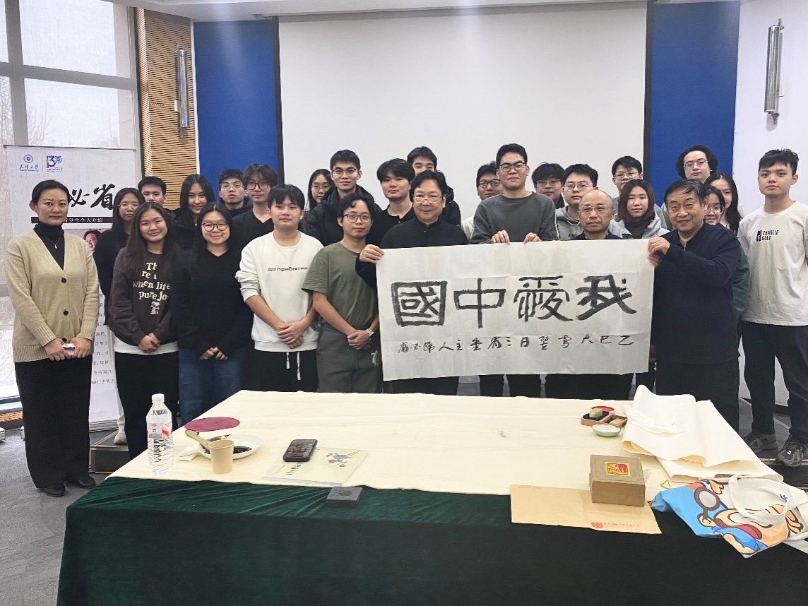 会议开始前,韩必省先生在第八会议室为23、24级海洋学院东盟留学生专班的学生们带来了一场别开生面的书法与绘画体验课,韩先生分享了自己近五十年书画生涯的感悟,为学生们示范书法技巧,更现场挥洒笔墨,为天津大学创作书法作品。笔走龙蛇间,既彰显雄浑壮阔的气魄,又蕴含深远绵长的韵味,引得现场师生阵阵赞叹。